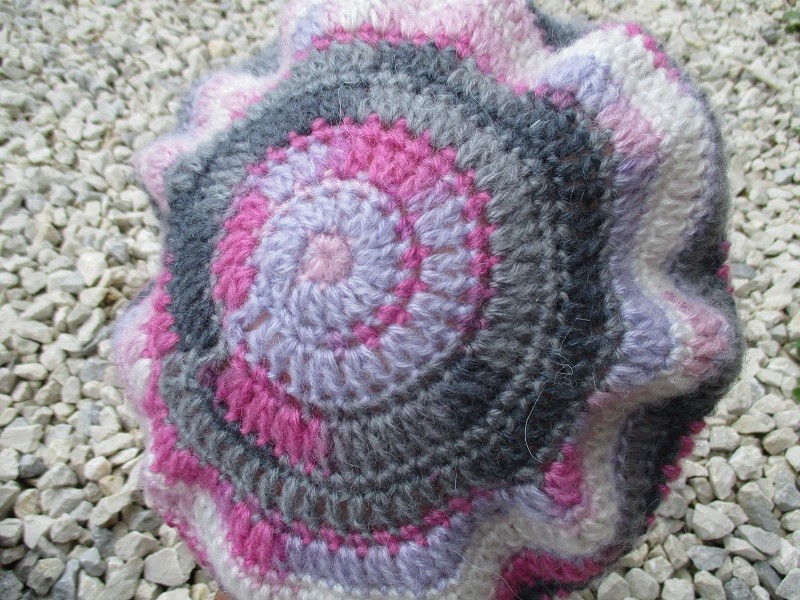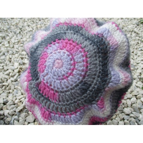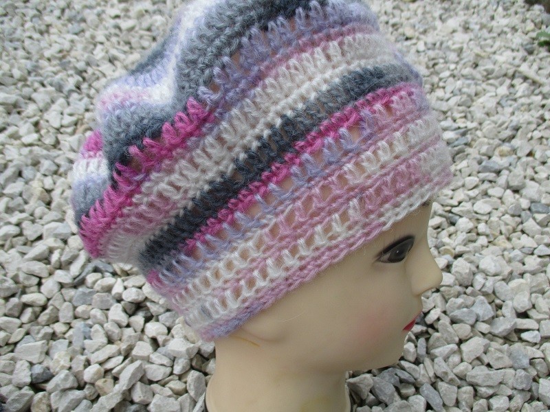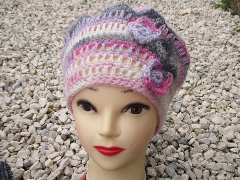 Béret fait main dans une laine moelleuse grise, rose et blanche.