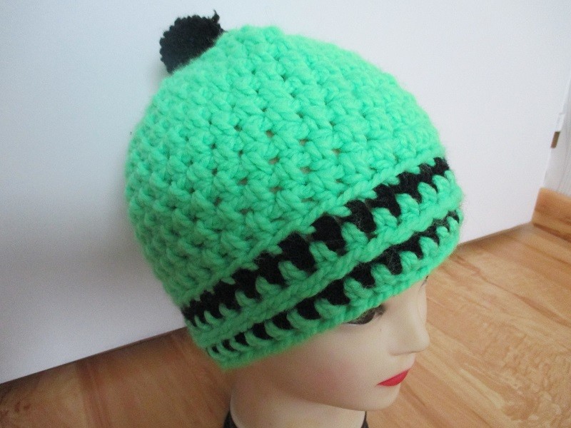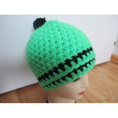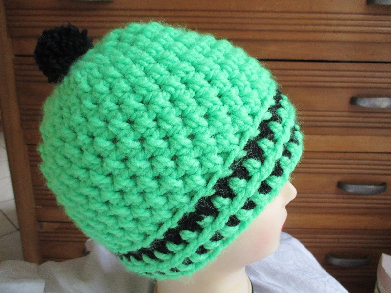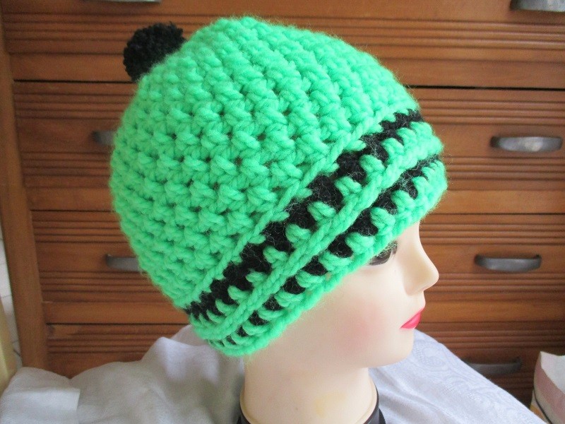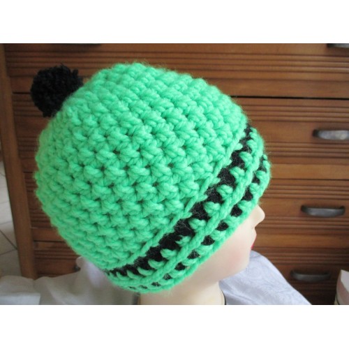 Laine acrylique épaisse vert fluo avec rayures noires et pompon noir.