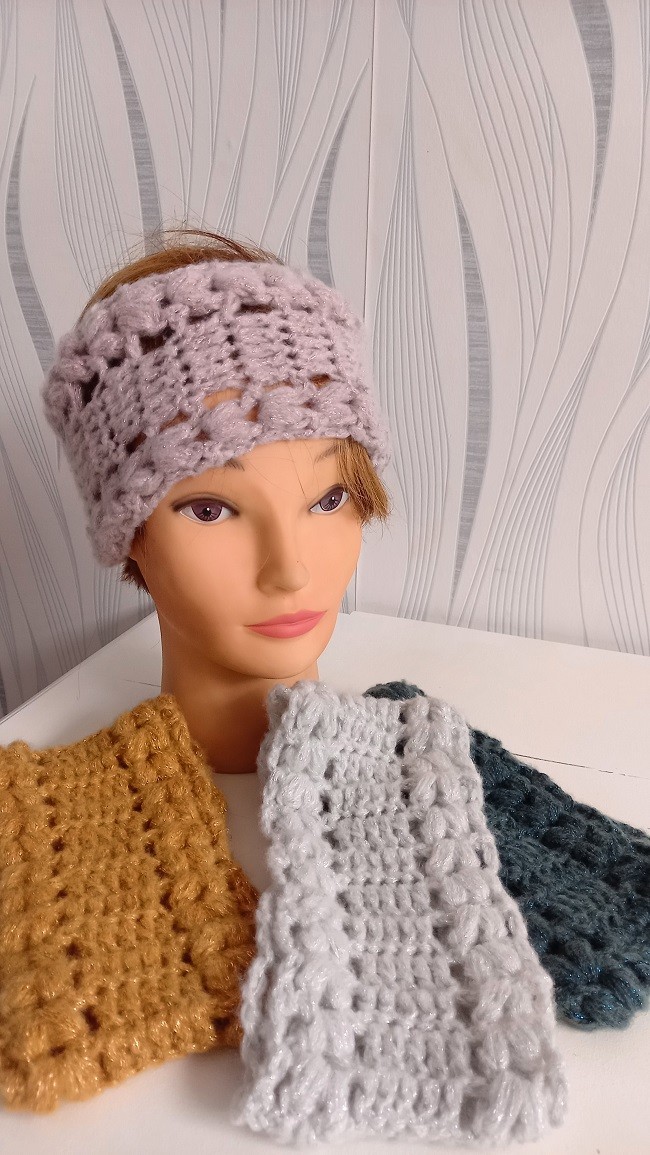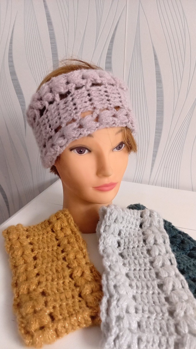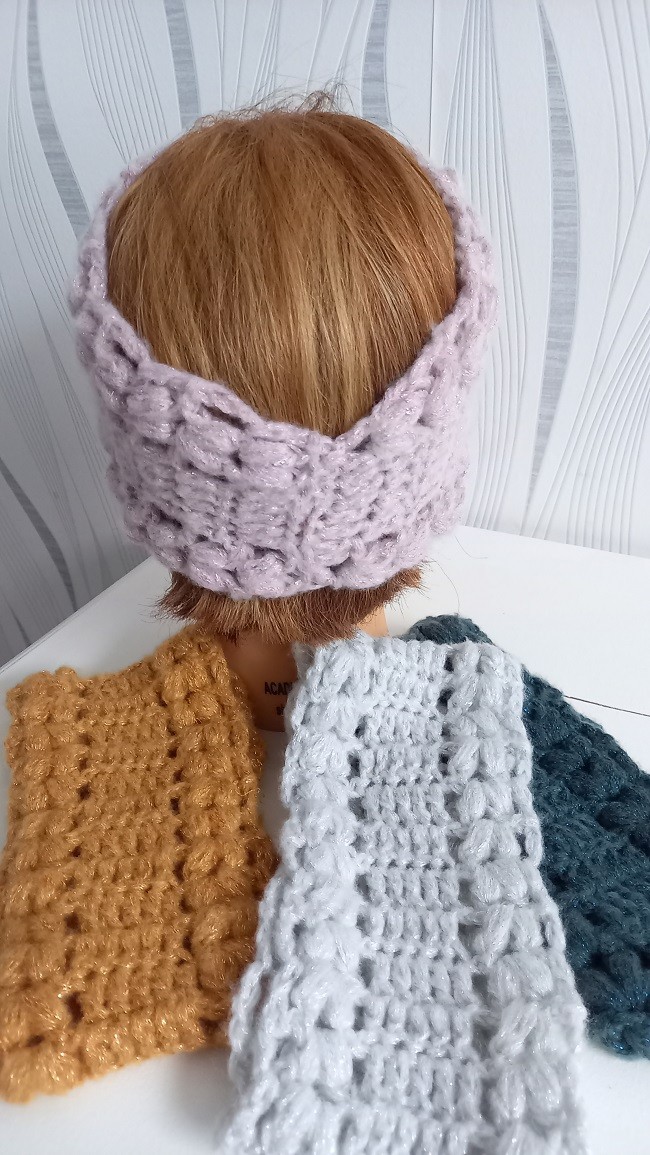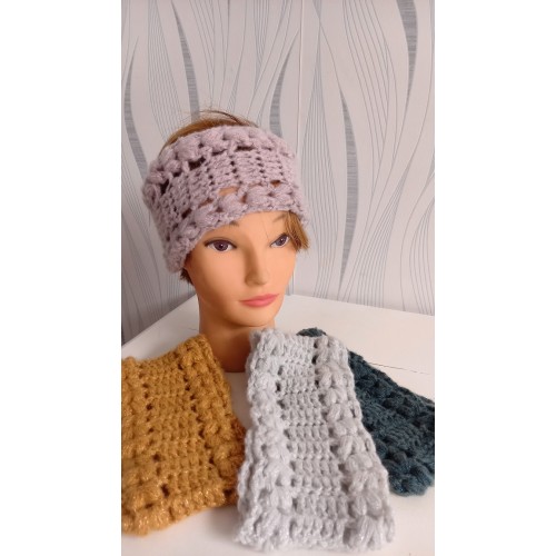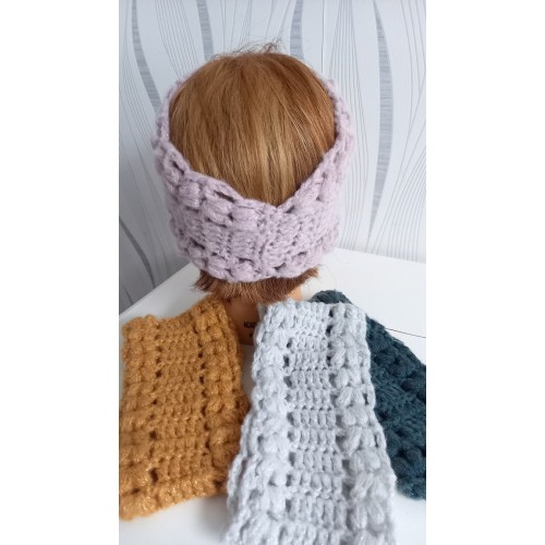 Bandeau très doux réalisé au crochet dans une laine brillante.
