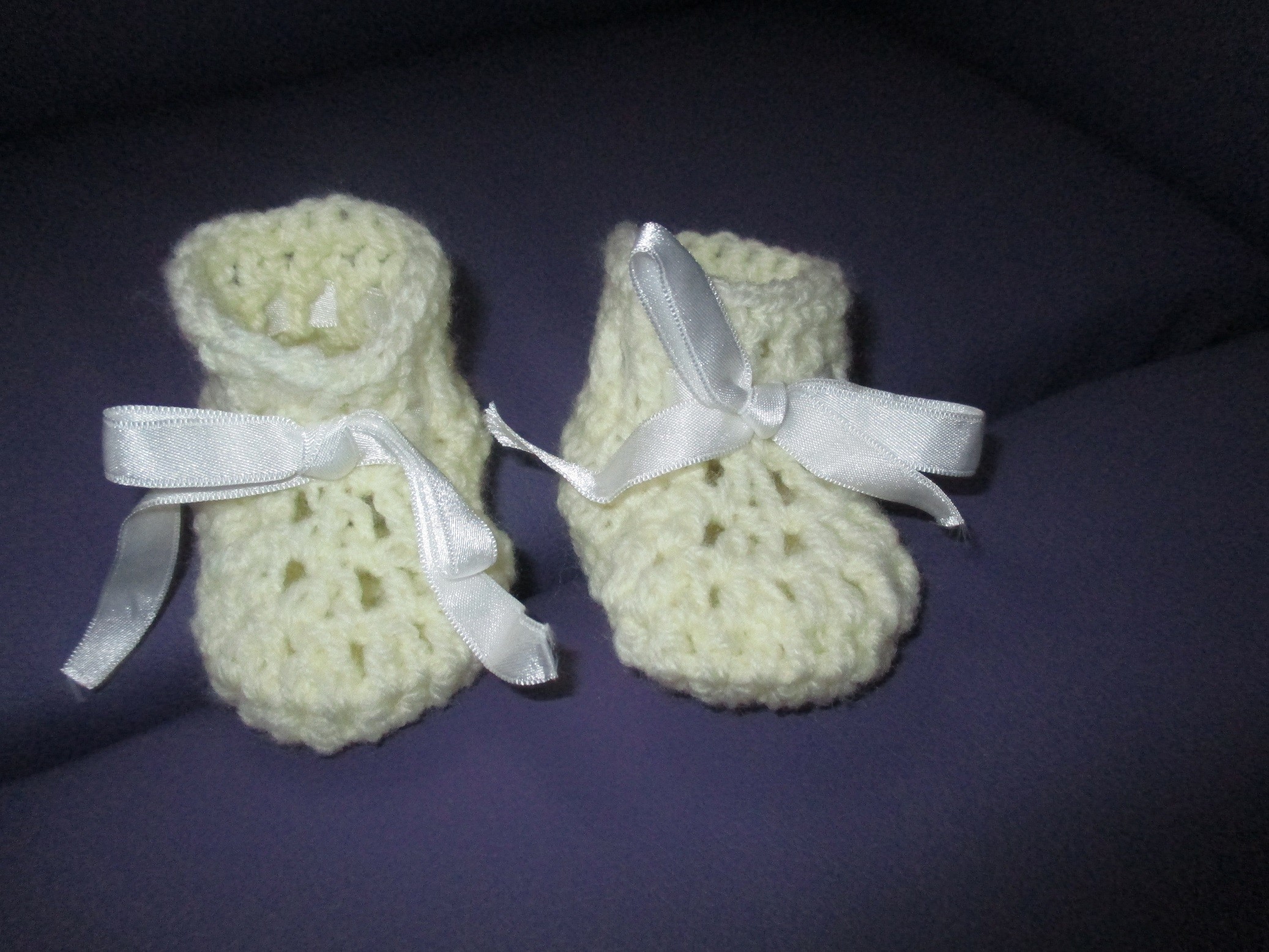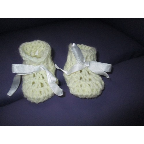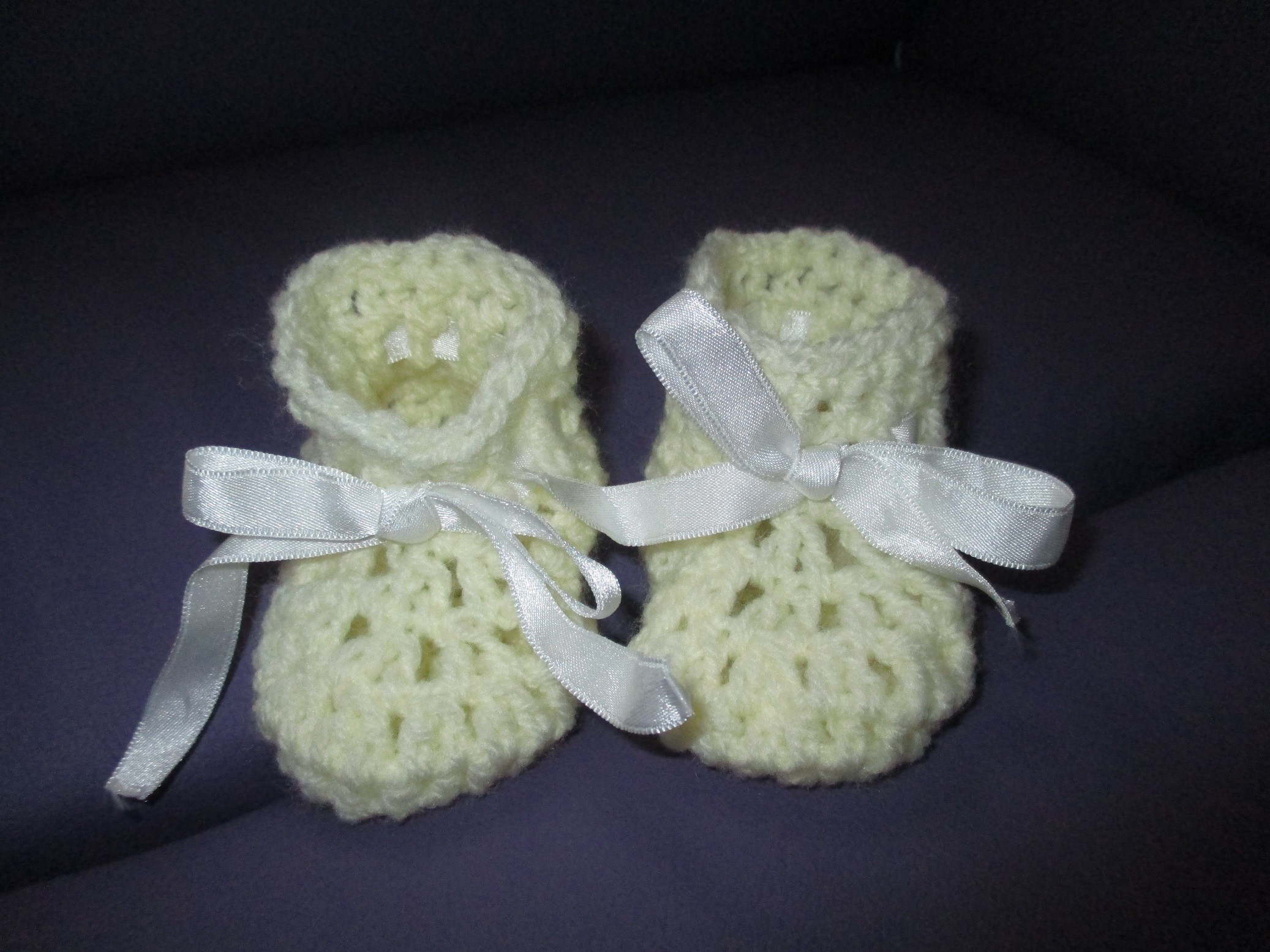 Ces chaussons sont crochetés en laine jaune pâle.