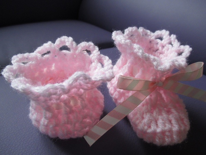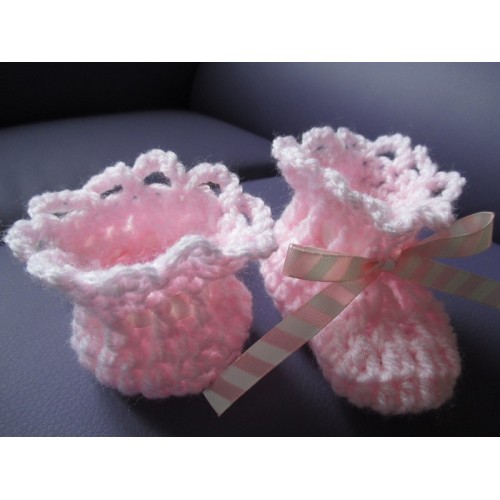 Ces chaussons sont crochetés en laine rose.
