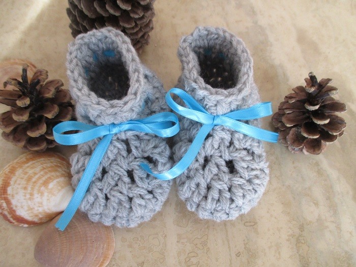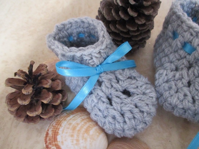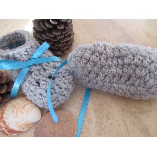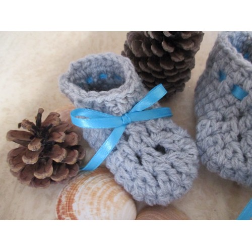 Ces chaussons sont crochetés en laine grise.
