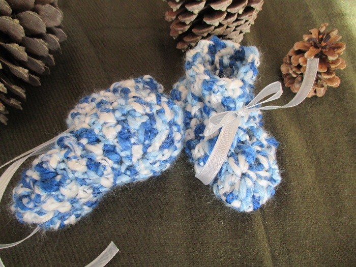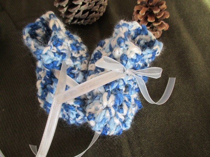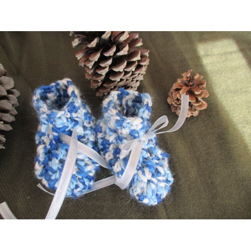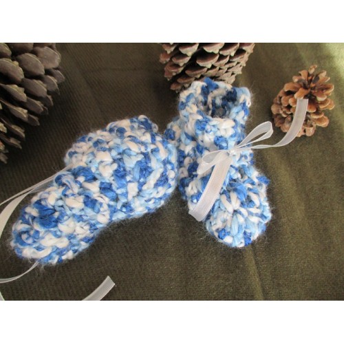 Ces chaussons sont crochetés en laine bleu et blanche toute douce.