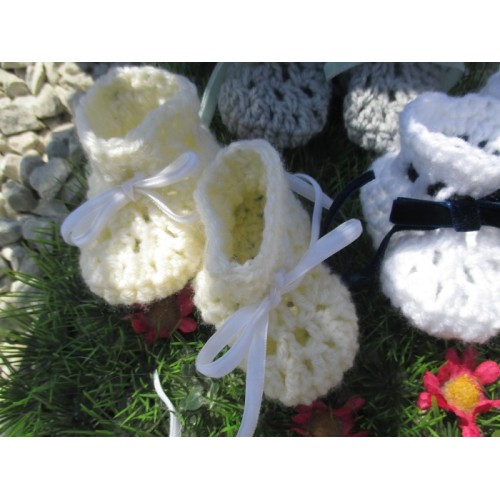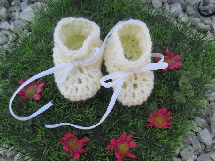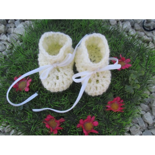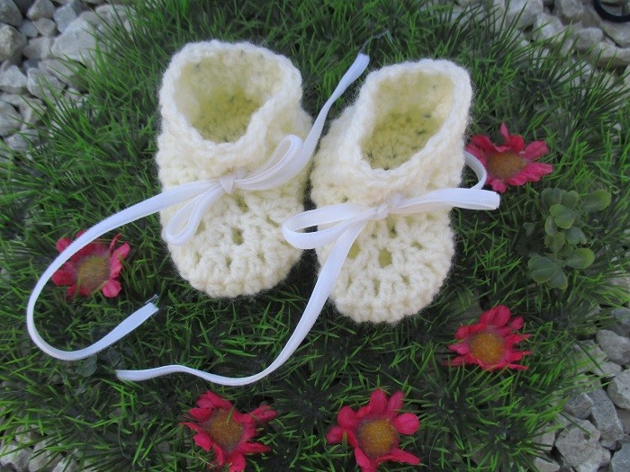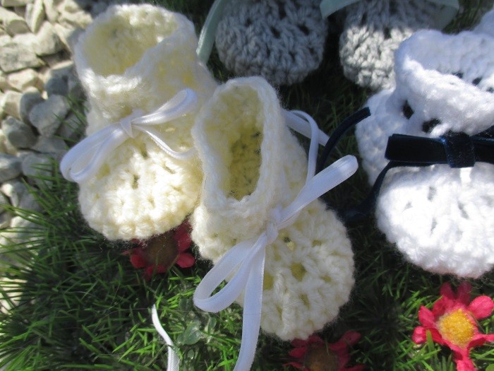 Ces chaussons sont crochetés en laine jaune pâle.