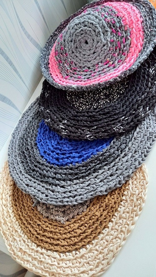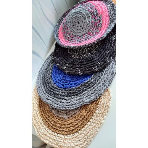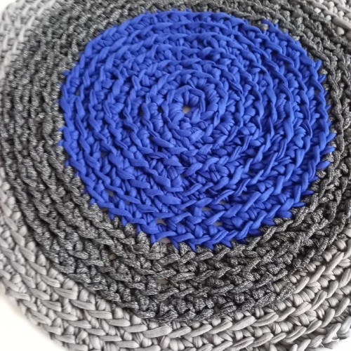 Petit tapis réalisé au crochet dans un coton recyclé bleu et gris