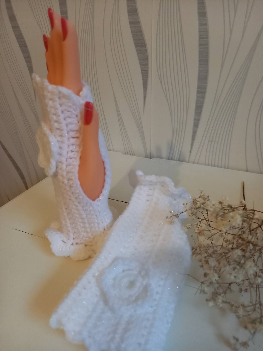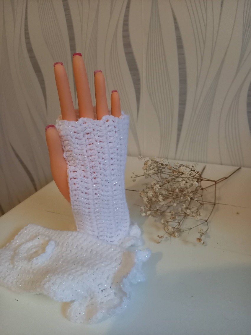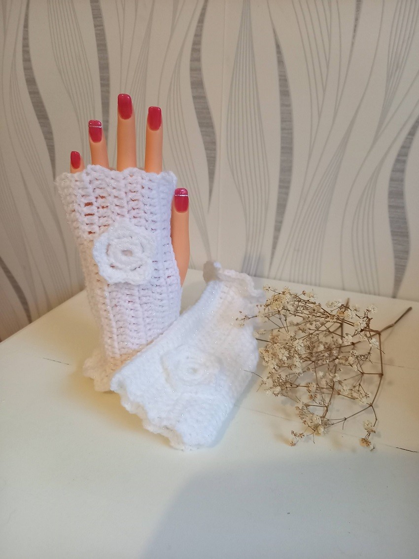 Mitaines réalisées au crochet avec fleur.