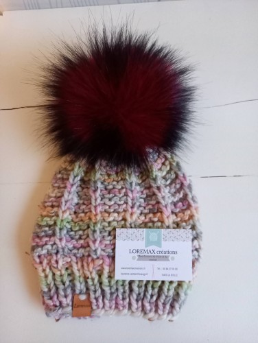 Bonnet en laine de couleur vert gris rose chiné tricoté main avec son pompon rouge bordeaux avec le bout des poils noirs en fourrure synthétique monté sur pression