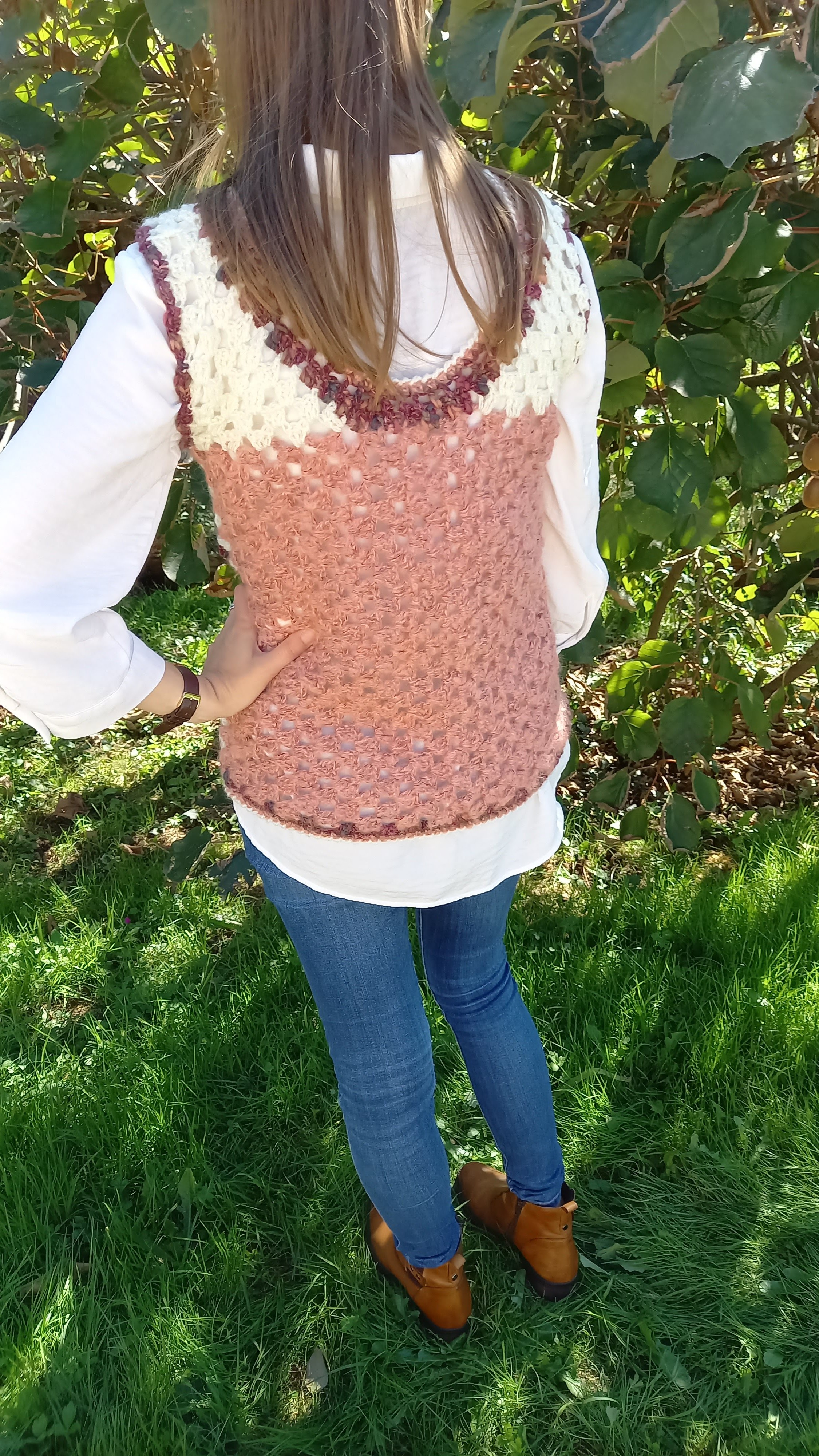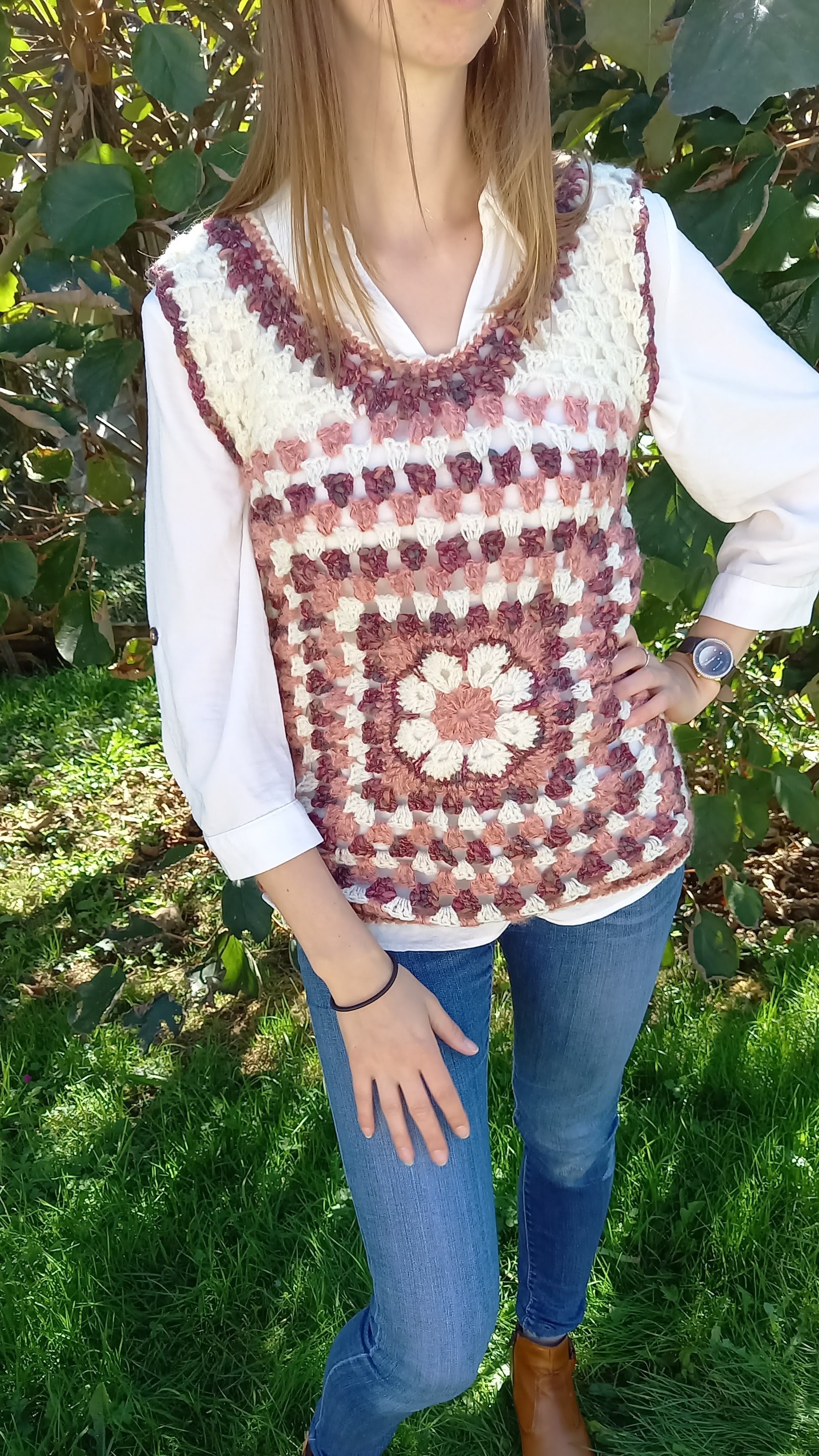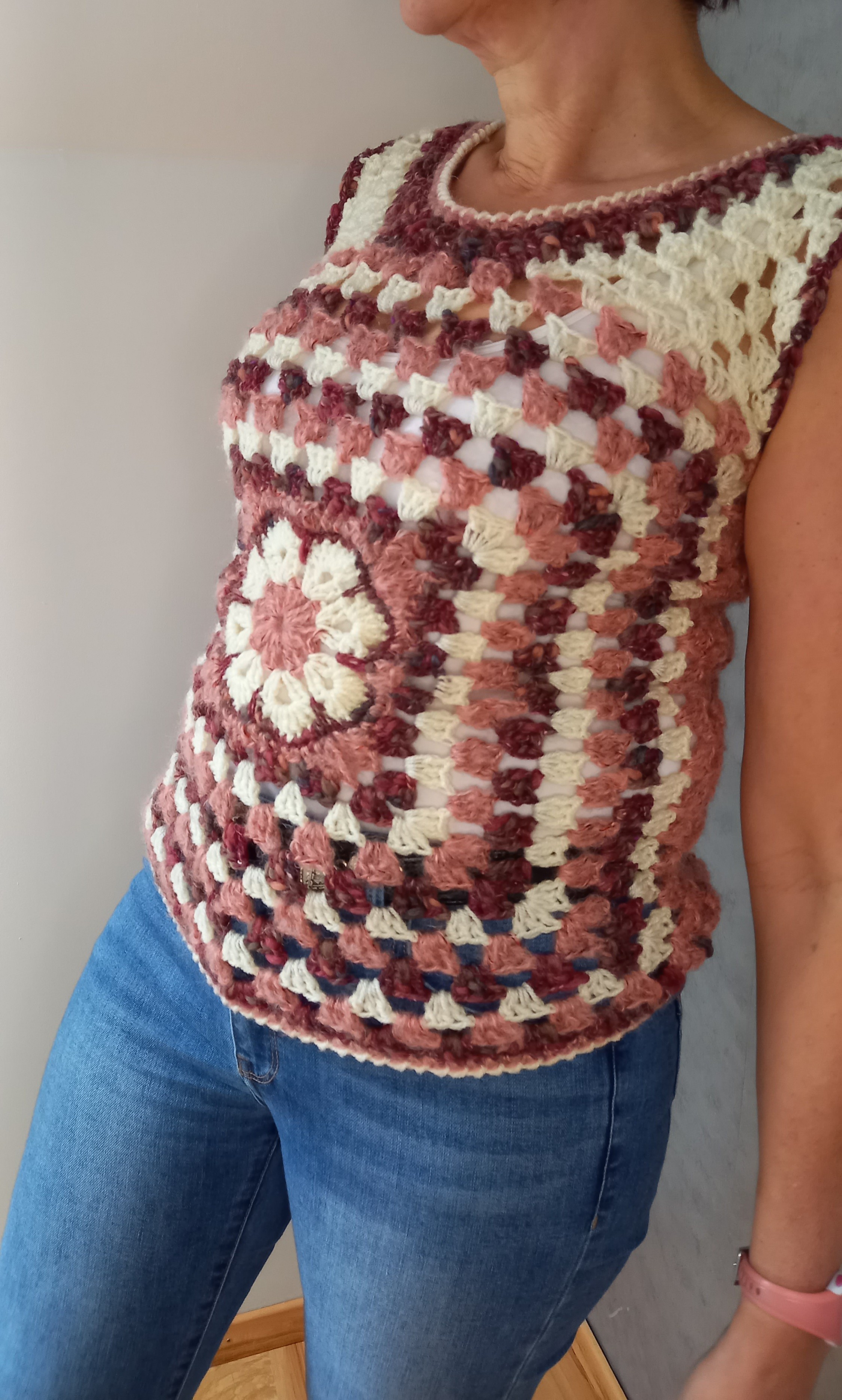 Ce top granny vous charmera par ce mélange subtile de couleurs écru rose et bordeaux.