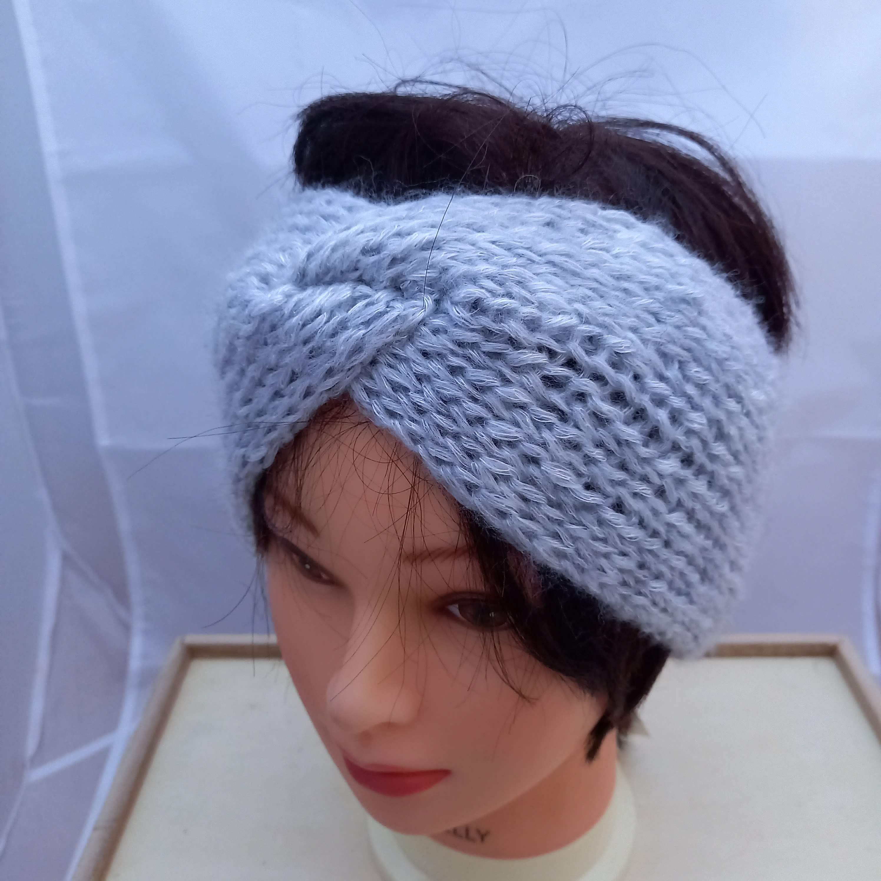 Bandeau gris brillant croisé pour cheveux femme en laine.