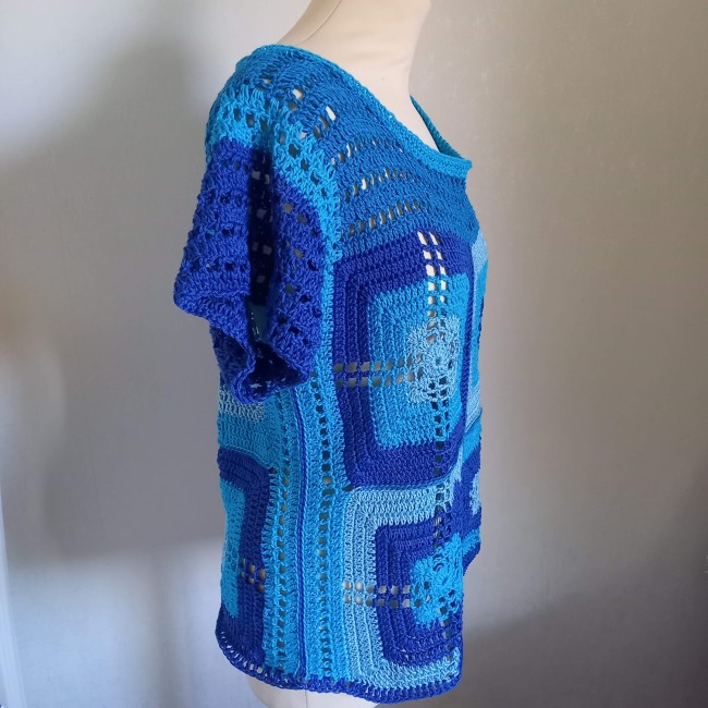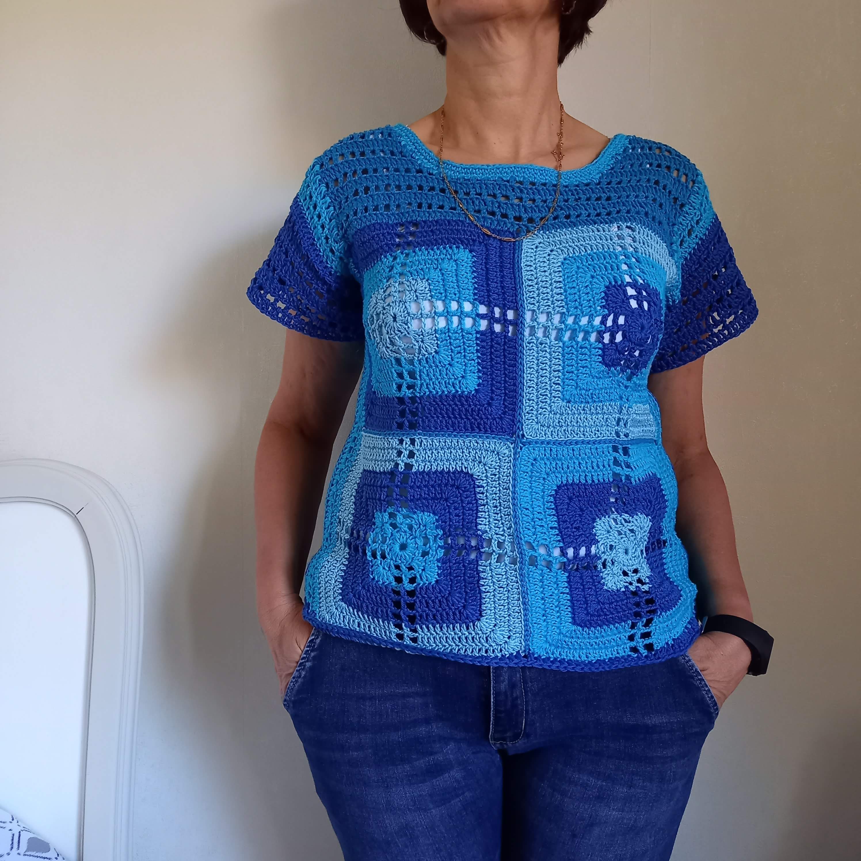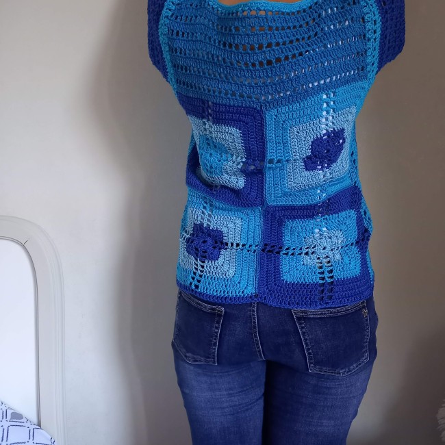 Super rendu pour se débardeur femme fait en granny square au crochet en fil coton dans différents tons de bleu .