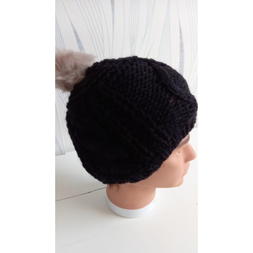 bonnet noir en laine avec pompon fourrure synthétique sur pression, bonnet homme, bonnet ski