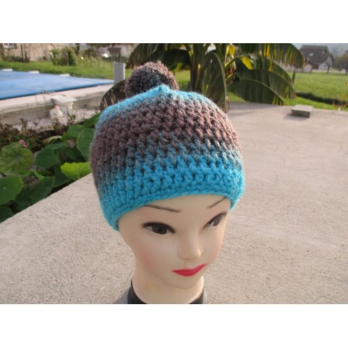 bonnet laine marron et bleu, bonnet ski homme avec pompon au crochet