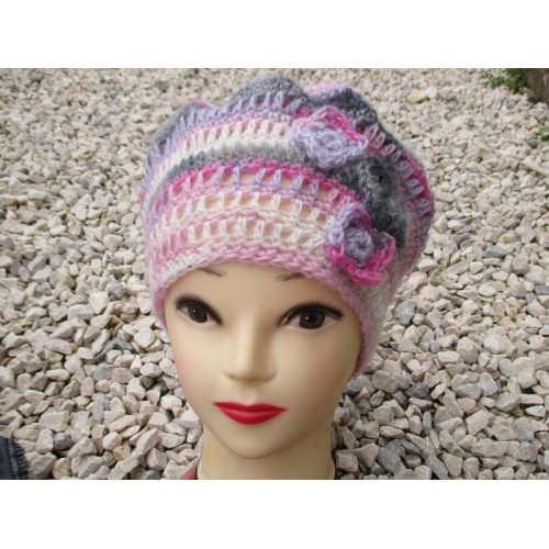 béret rose, béret angora, bonnet laine rose, bérêt laine angora blanc et gris au crochet